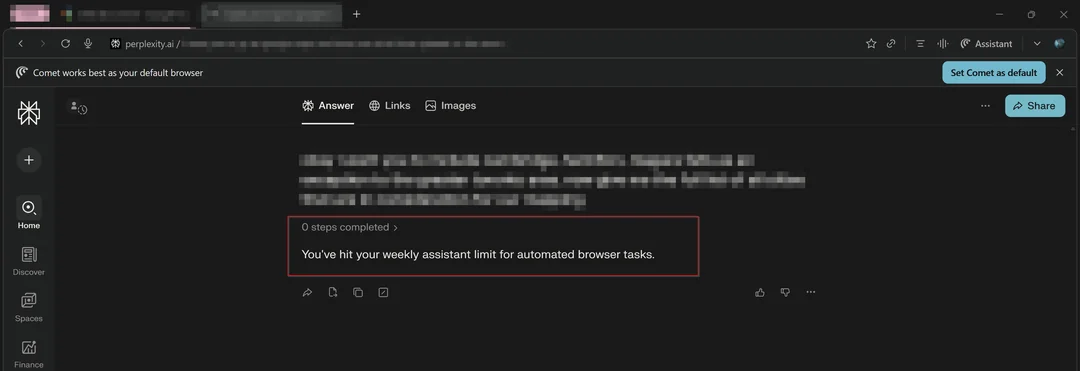 被 Perplexity Comet 浏览器“您已达到本周助手自动浏览任务的使用上限”打断的一天|一条真实使用记录