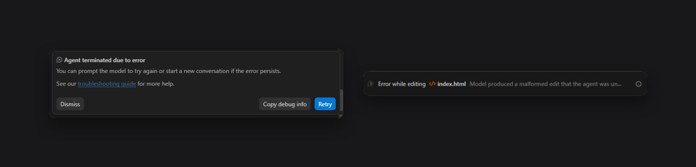 Error while editing index.html和Model produced a malformed edit...,并给了Copy debug info、Retry按钮