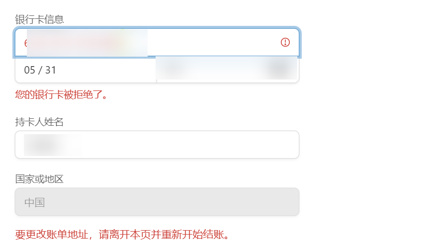 一开始我以为是卡的问题。第一张卡被拒后,我换了另一张双币信用卡,结果还是"银行卡被拒绝了"。接着又换了张全币种卡,依然被拒。