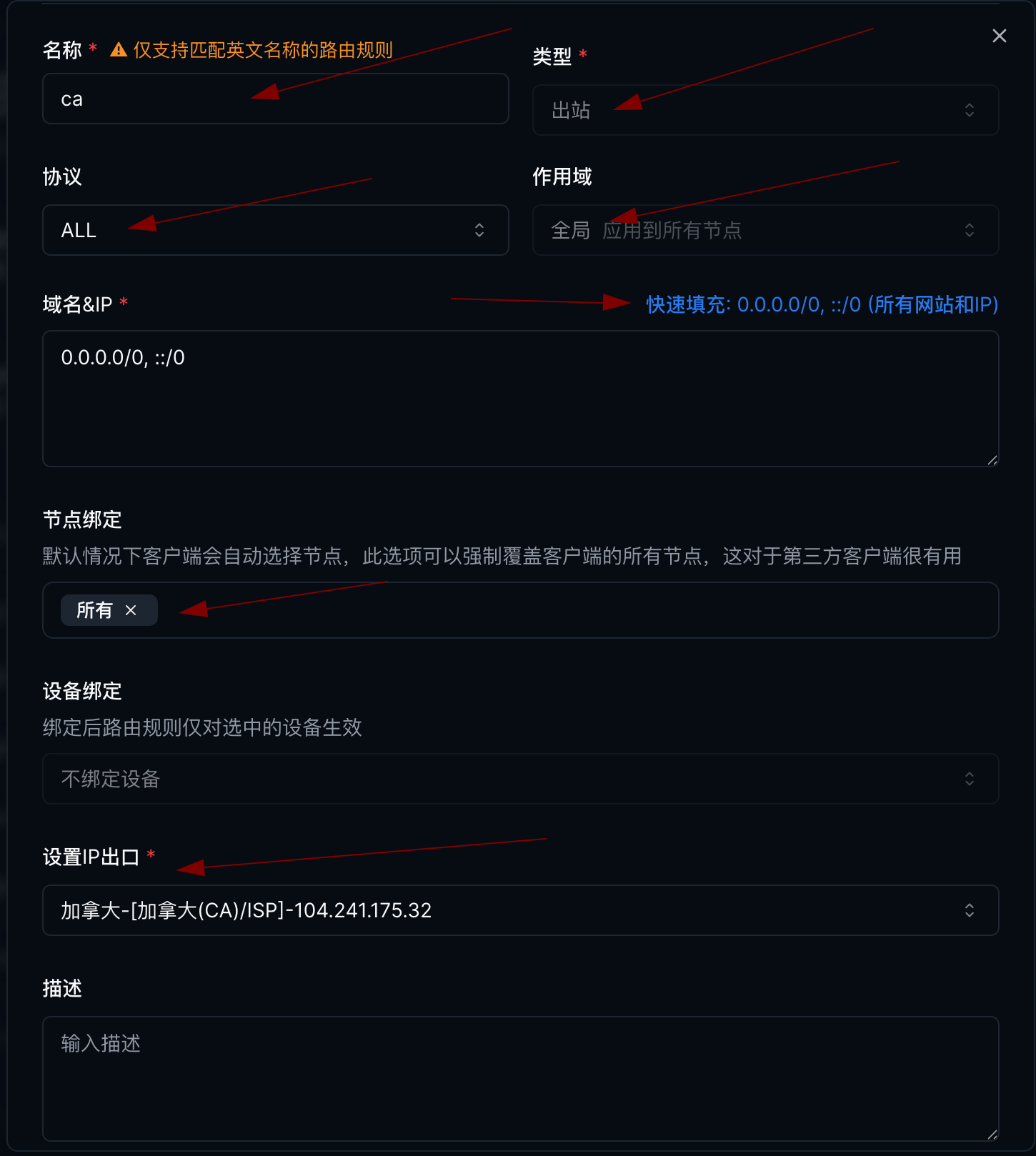 0.0.0.0/0,::/0 - 在 设置 IP 出口 栏中选择步骤一中创建的住宅 IP