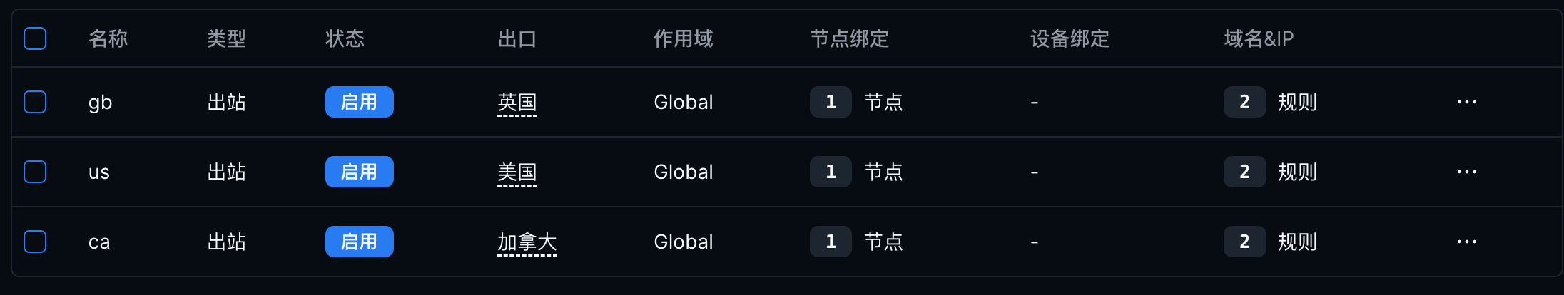 | 名称 | 路由规则的标识名称 | us, ca, jp |