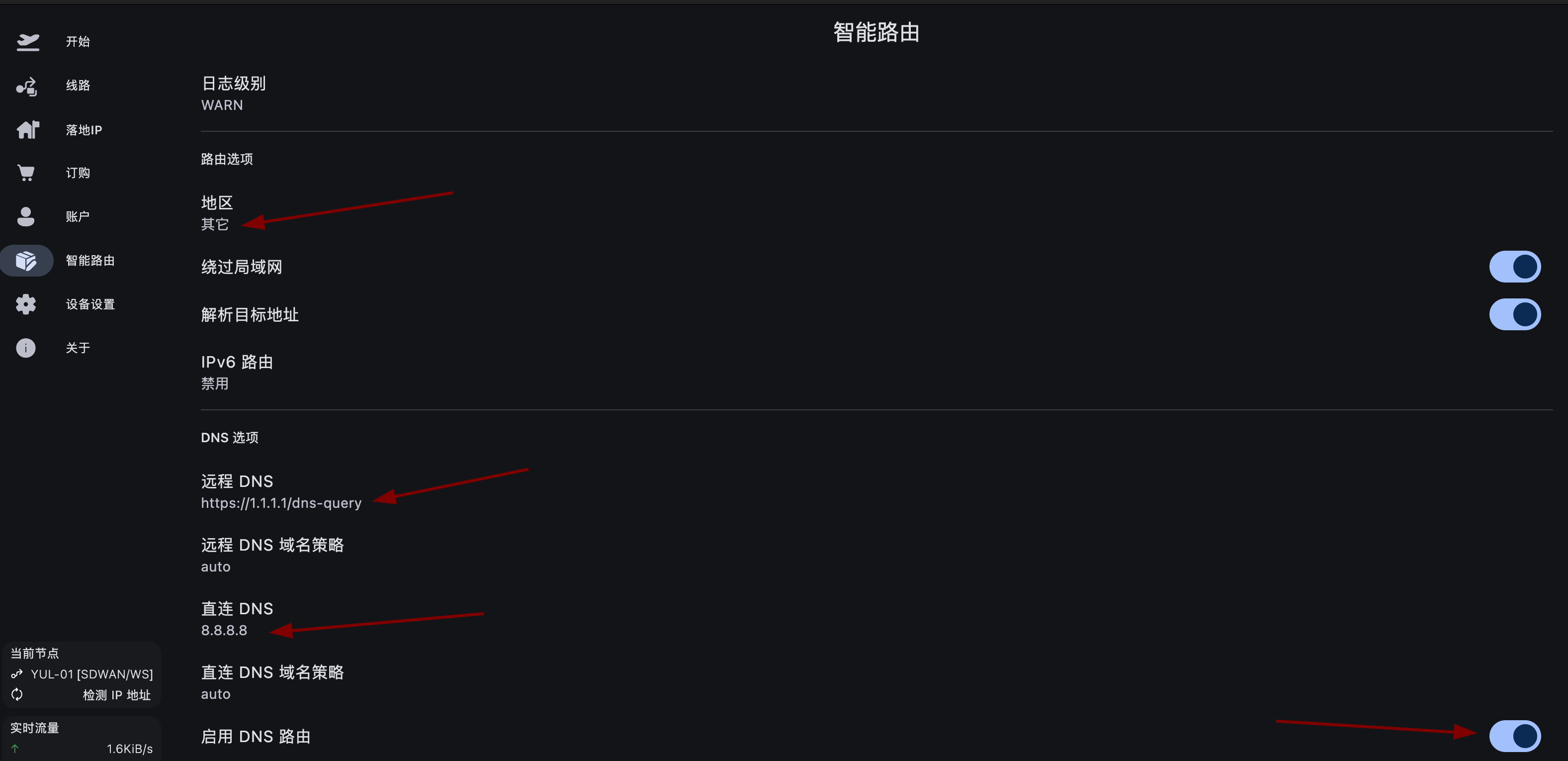 重要提示: 请确认你的系统网络 DNS 服务器未使用中国大陆的 DNS 服务器,因为中国大陆 DNS 服务器存在污染,如果使用了受污染的 DNS 服务,即使开启全局模式也可能无法正常访问海外服务。