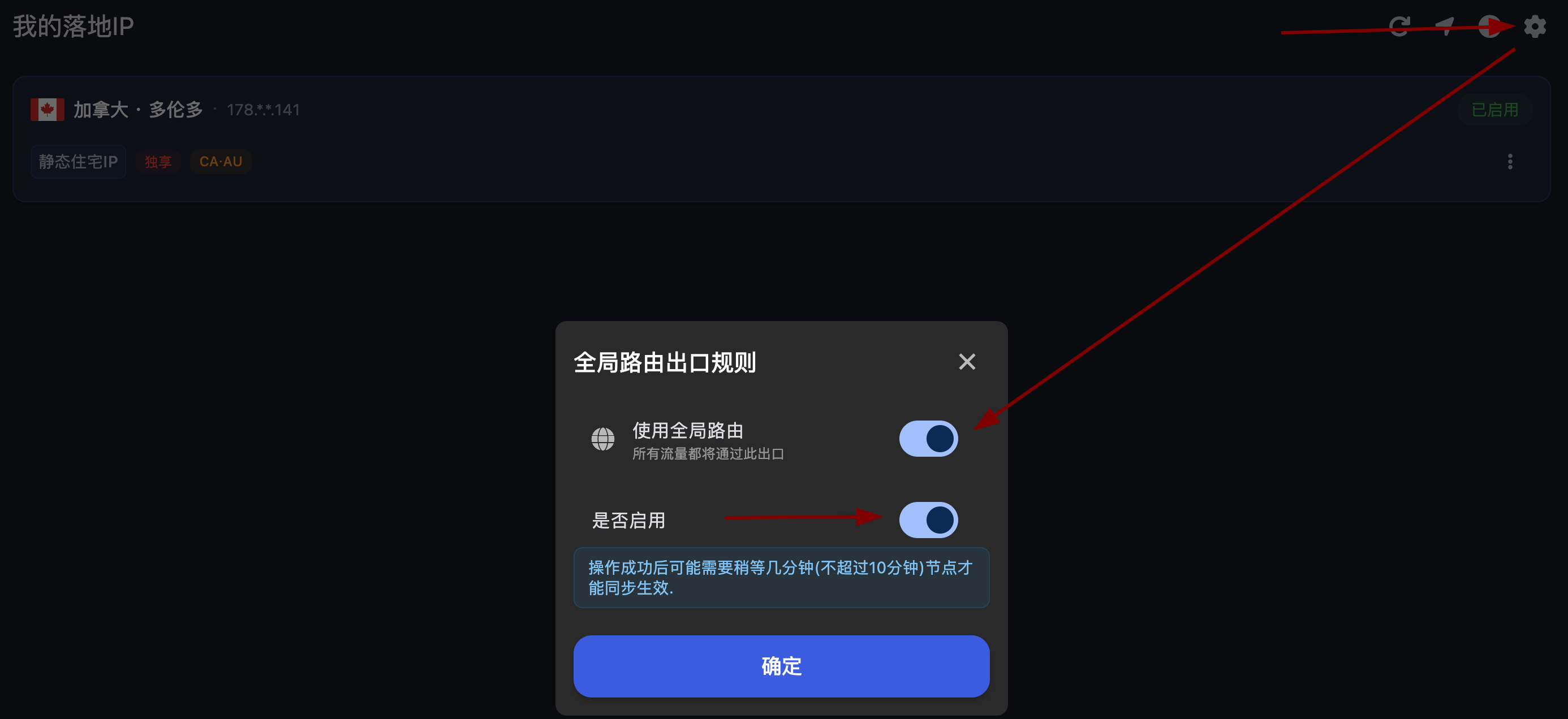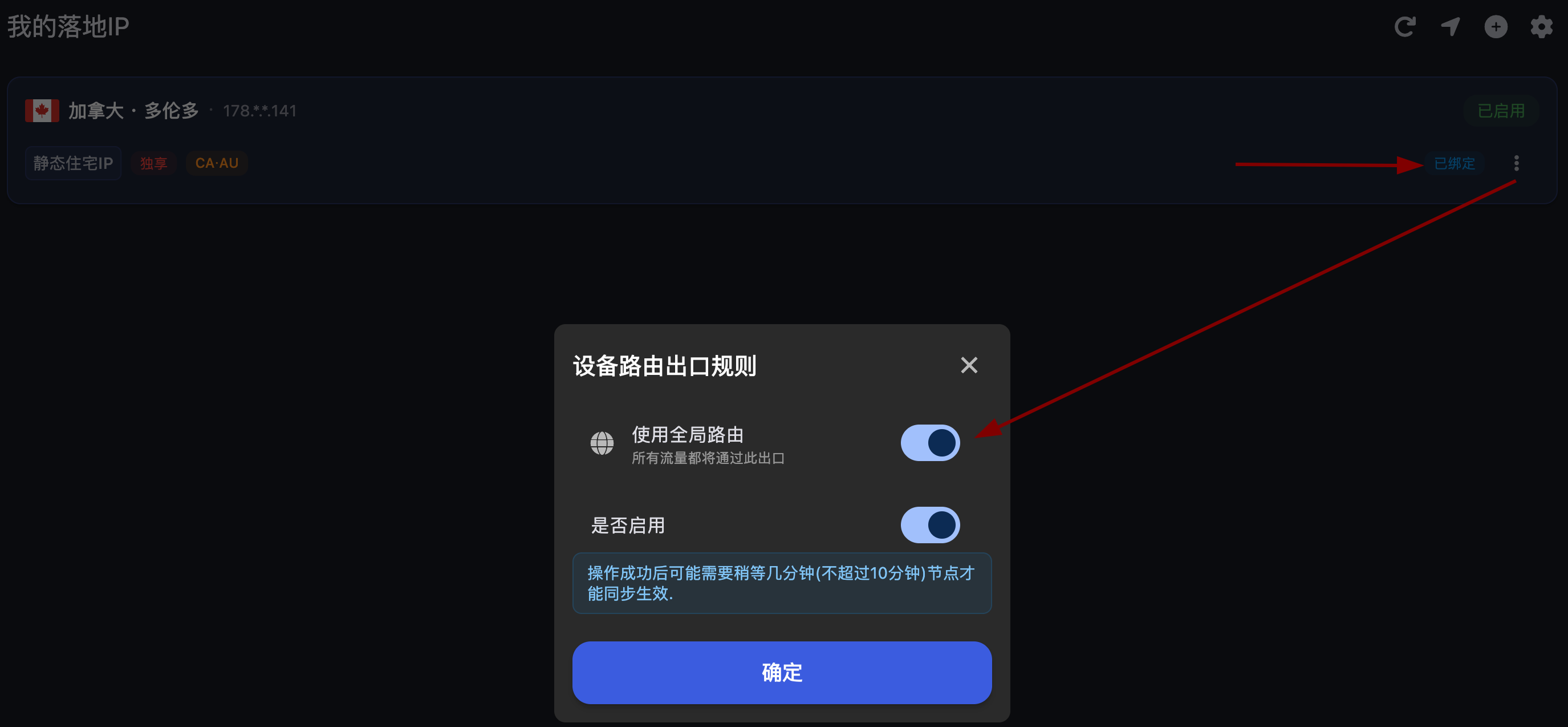 在落地 IP 页面设置出口路由。
