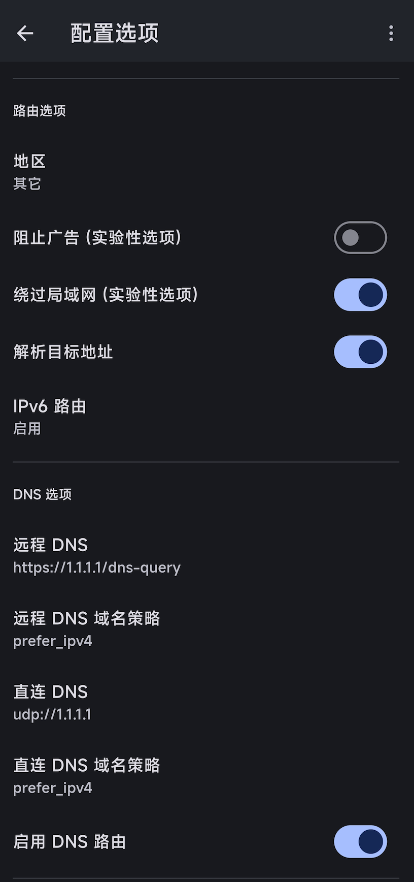 - 直连 DNS: udp://1.1.1.1, 注意: 此值要根据上面设置的地区选项来选择, 必须设置为该地区的本土 DNS 服务器才能达到最佳分流效果