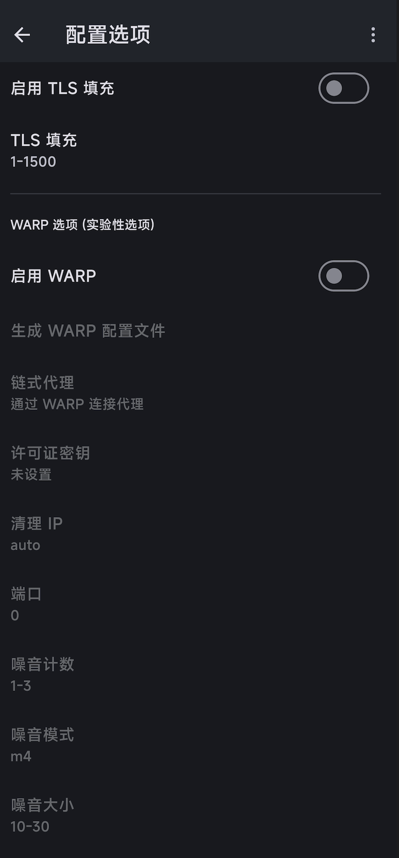 保持 TLS 填充与 WARP 相关选项为默认状态, 不启用实验功能。